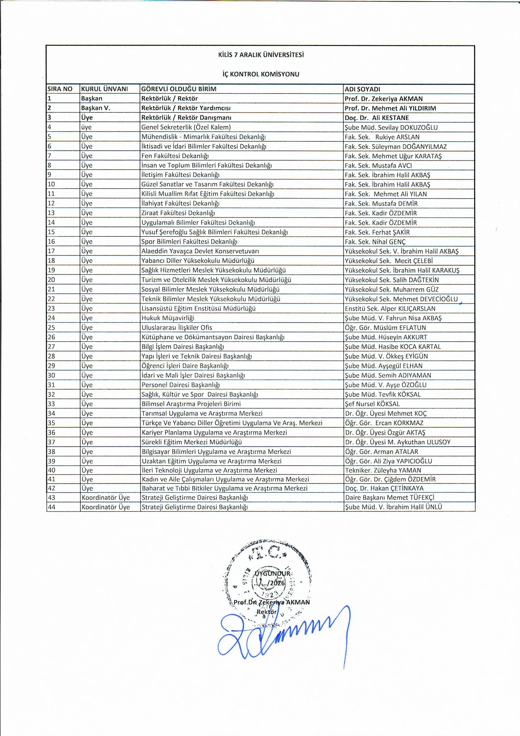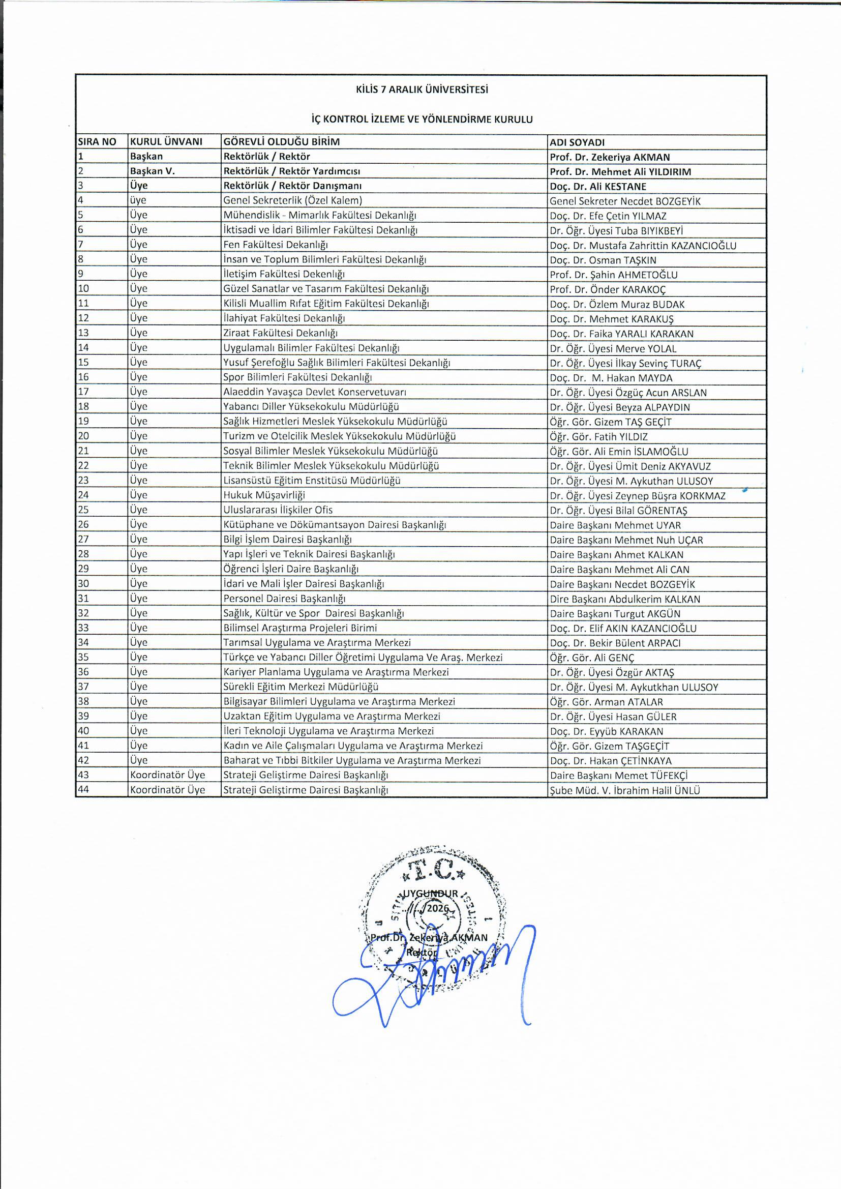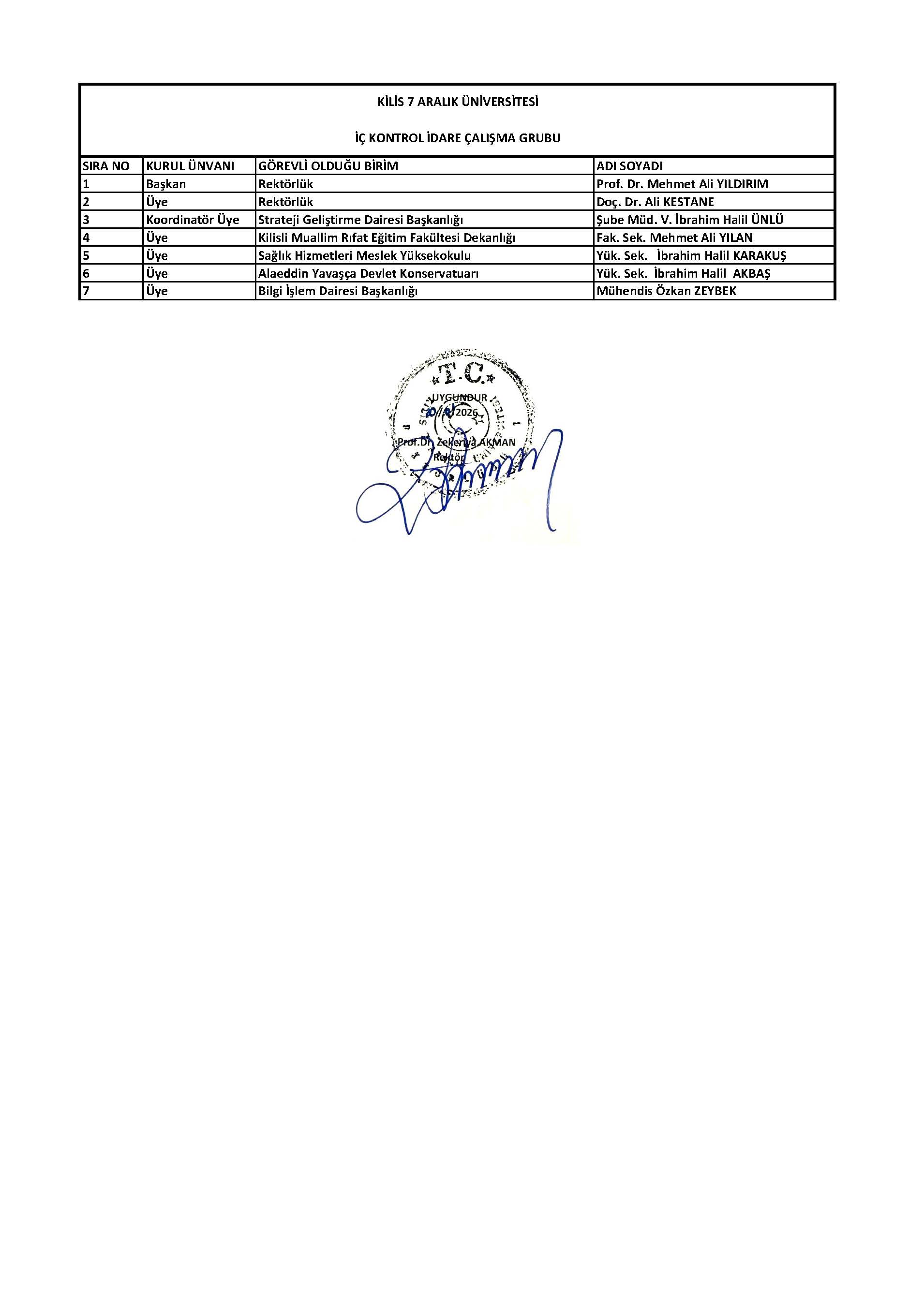 Üniversitemiz Senatosunun 02.09.2021 tarih ve 20 nolu toplantısında; Üniversitemiz “İç Kontrol Sistemi Yönergesi” kabul edilmiş olup, Strateji Geliştirme Daire Başkanlığı Koordinatörlüğünce Üniversitemiz “İç Kontrol İzleme ve Yönlendirme Kurulu, İç Kontrol Komisyonu ve İç Kontrol İdare Çalışma Grubu” oluşturulmuştur. 20.01.2026 tarihinde İç Kontrol İzleme ve Yönlendirme Kurulu, İç Kontrol Komisyonu ve İç Kontrol İdare Çalışma Grubu güncellenerek; Rektörümüz Prof. Dr. Zekeriya AKMAN tarafından onaylanmıştır.